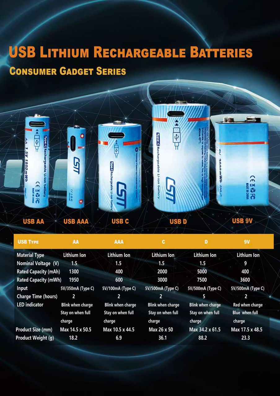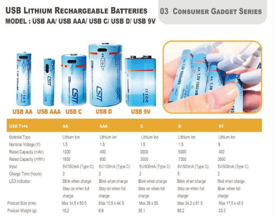 batteries lithium-ion rechargeables via USB de la gamme « Consumer Gadget ».